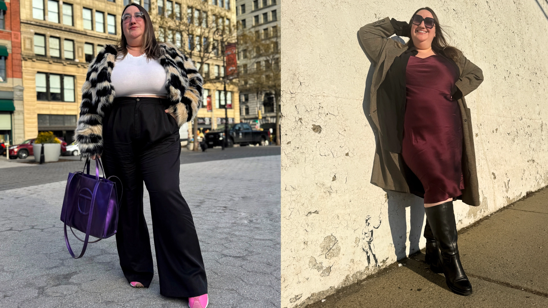 For this look, I paired this lightweight silk slip dress from Quince with an oversized semi-sheer button down from inclusive indie label Pinecone Row. To make it work for chilly January temperatures, I wore a longtime favorite Baacal plaid car coat (similar) on top, and added weather-resistant lug-sole boots. (This pair comes in multiple calf widths, too!) Altogether, this look was cool and comfortable, and not at all precious—silk doesn’t always have to be dainty, after all!