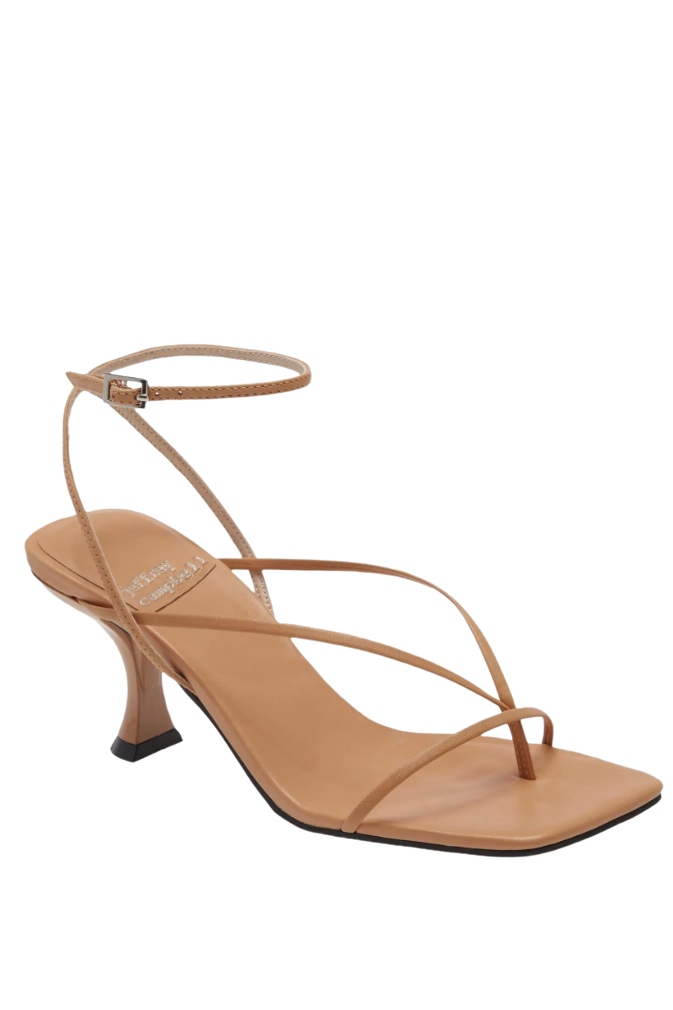 Instead of opting for a barely-there number, keep things classy with an off-the-shoulder dress that still offers a solid amount of coverage. Complete your look by matching strappy sandals and a mini handbag.