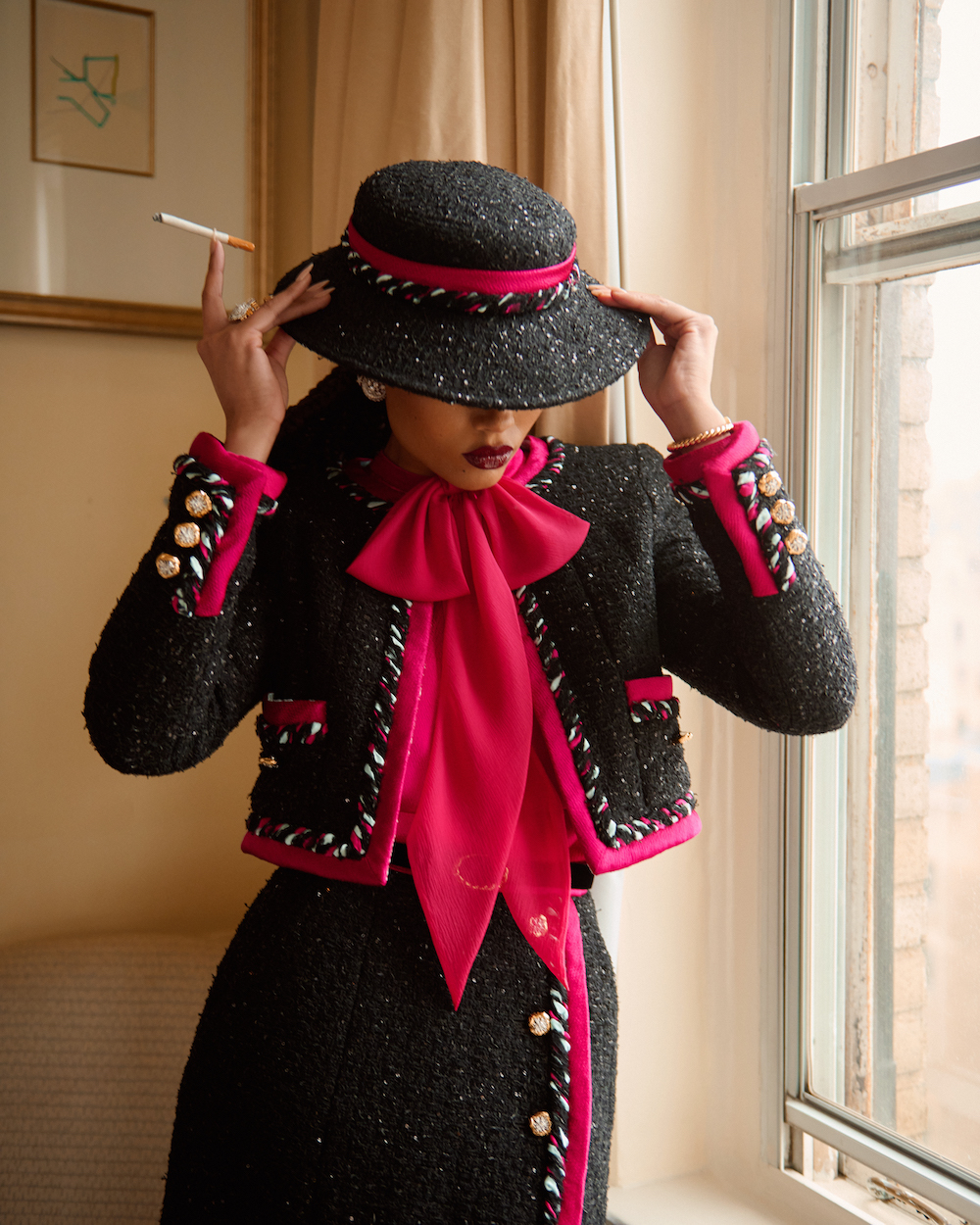 Hairstylist Naeemah Lafond emphasized the placement of the tweed Chanel hat, with Peak's hair cascading over her shoulders behind her, revealing only a glimpse of a braided kiss curl on her cheek. "I just wanted to have a little more drama and the hat definitely definitely served in that category," Peak says.